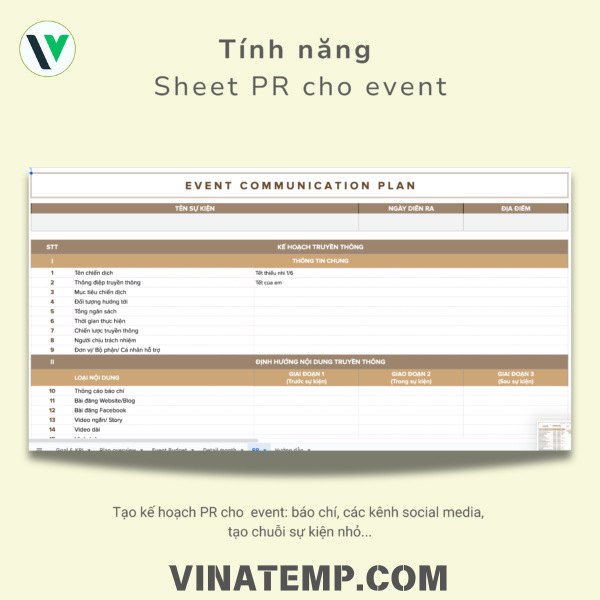 Bên cạnh đó, bảng tính này cũng hỗ trợ việc lập kế hoạch cho chiến dịch truyền thông của sự kiện. Bạn có thể ghi lại các kênh truyền thông mà bạn muốn sử dụng, nội dung quảng cáo, ngân sách và các mục tiêu mà bạn muốn đạt được.
